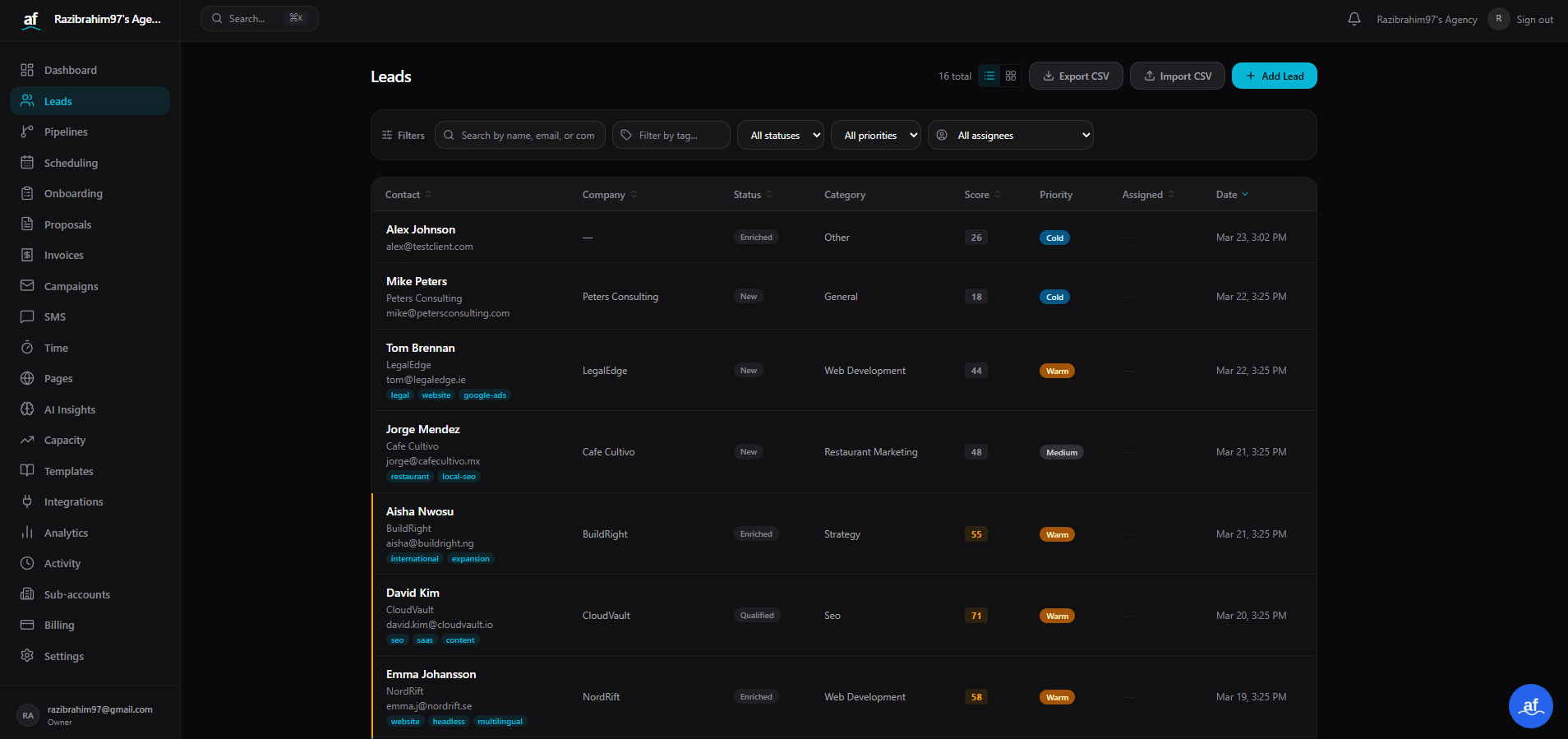 AgenciesFlow scores every inbound inquiry 0–100 before your team sees it. Capture leads from your website, email, WhatsApp, and LinkedIn — then hand qualified deals straight into onboarding.
